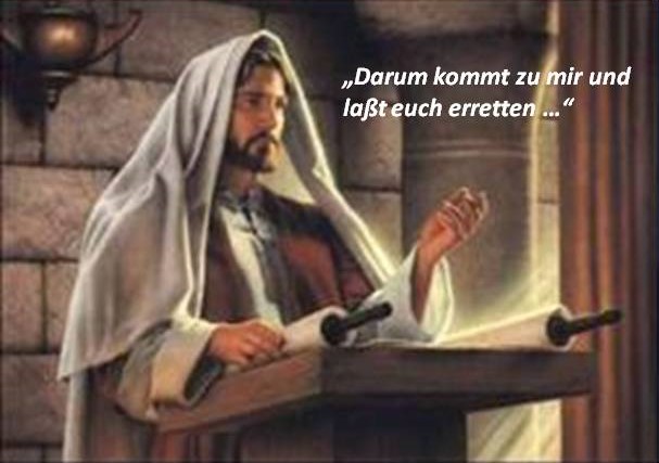 Darum kommt zu mir und lasst euch erretten. Jesus Christus erklärt der versammelten Menge am Tempelplatz im Land Überfluss (Bountiful) in Amerika (mögliche Lage siehe Karte hier), dass, um in das `Himmelreich´ eingehen zu können, `Errettung´ durch ihn erforderlich ist, und die ist nur möglich, wenn die Menschen zu ihm kommen und seine Gebote, die er vom Vater bekommen hat (3. Nephi 12:19), halten.